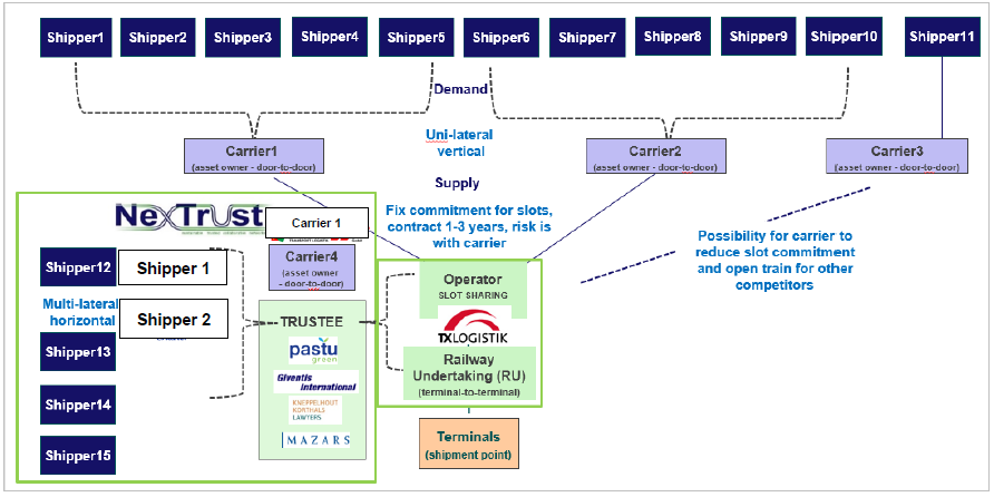 In this new business model a trustee facilitates horizontal and vertical cooperation's between all partners involved. This allows a fair risk sharing and to overcome constraints when setting up and operating combined transportation services. Furthermore it enables competing companies to join cooperation whilst ensuring anti-trust compliance.