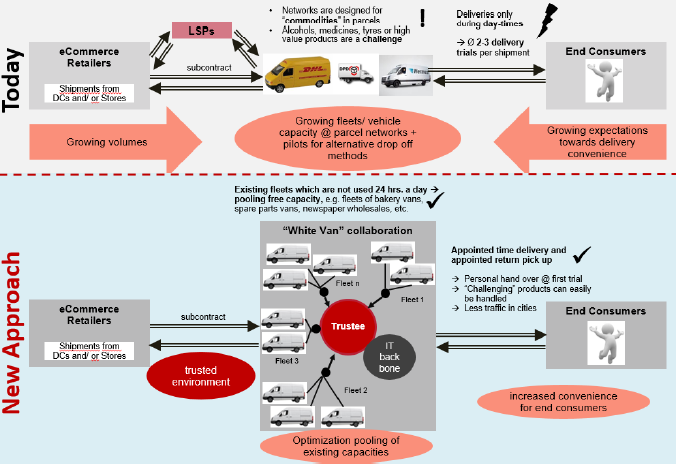 - To form a horizontal collaboration between delivery vehicle owners (i.e. grocery chains, retail chains, newspaper delivery networks, rental companies) in a trusted network by tapping and pooling their āunderutilizedā fleets. This will lead to a more efficient and sustainable use of resources by extending the ādrivingā hours during which the vehicles are used.